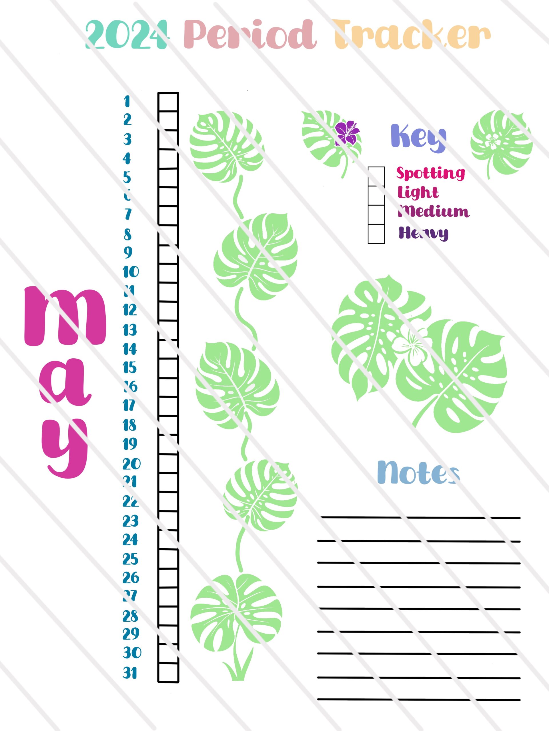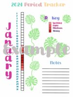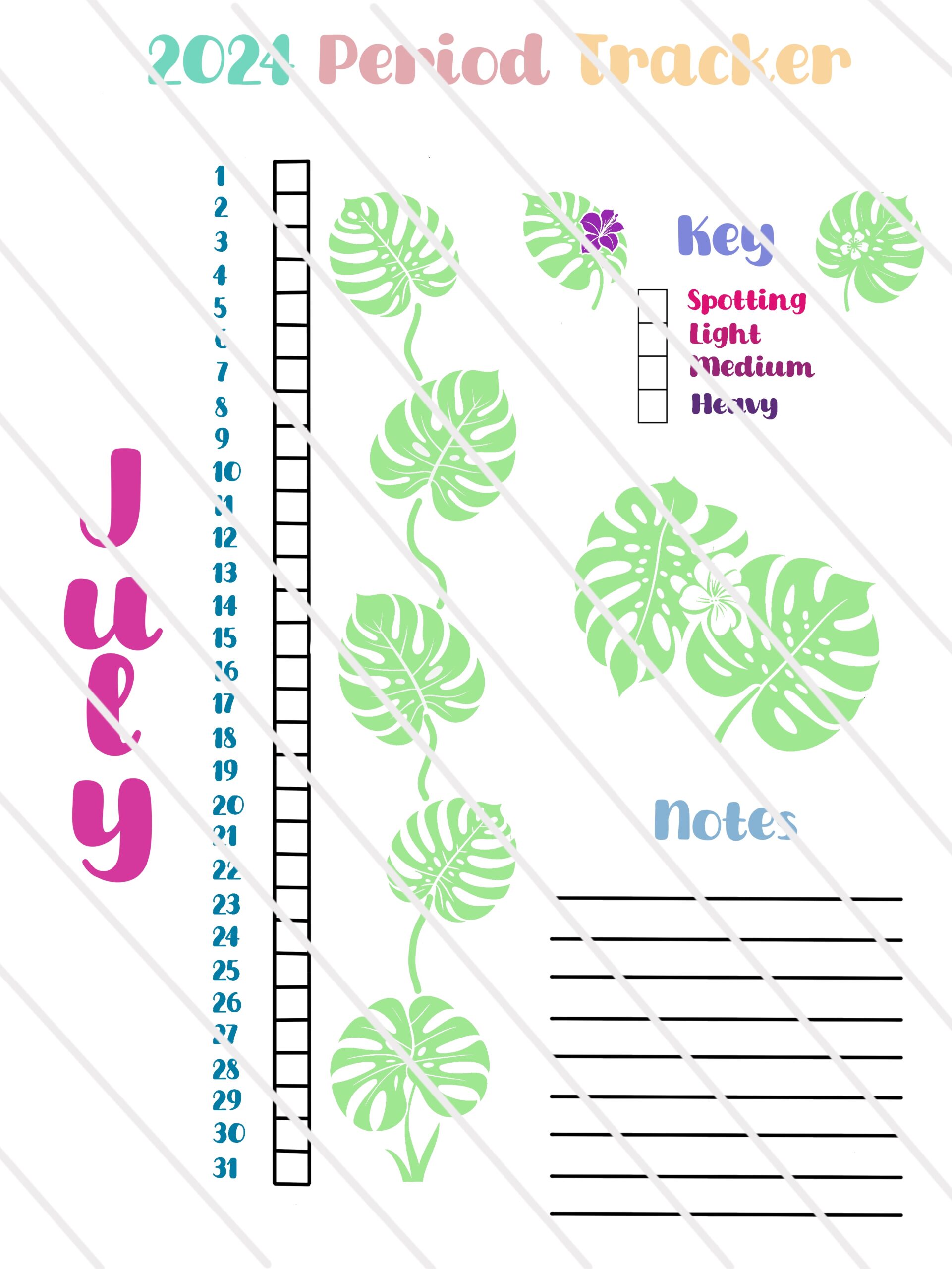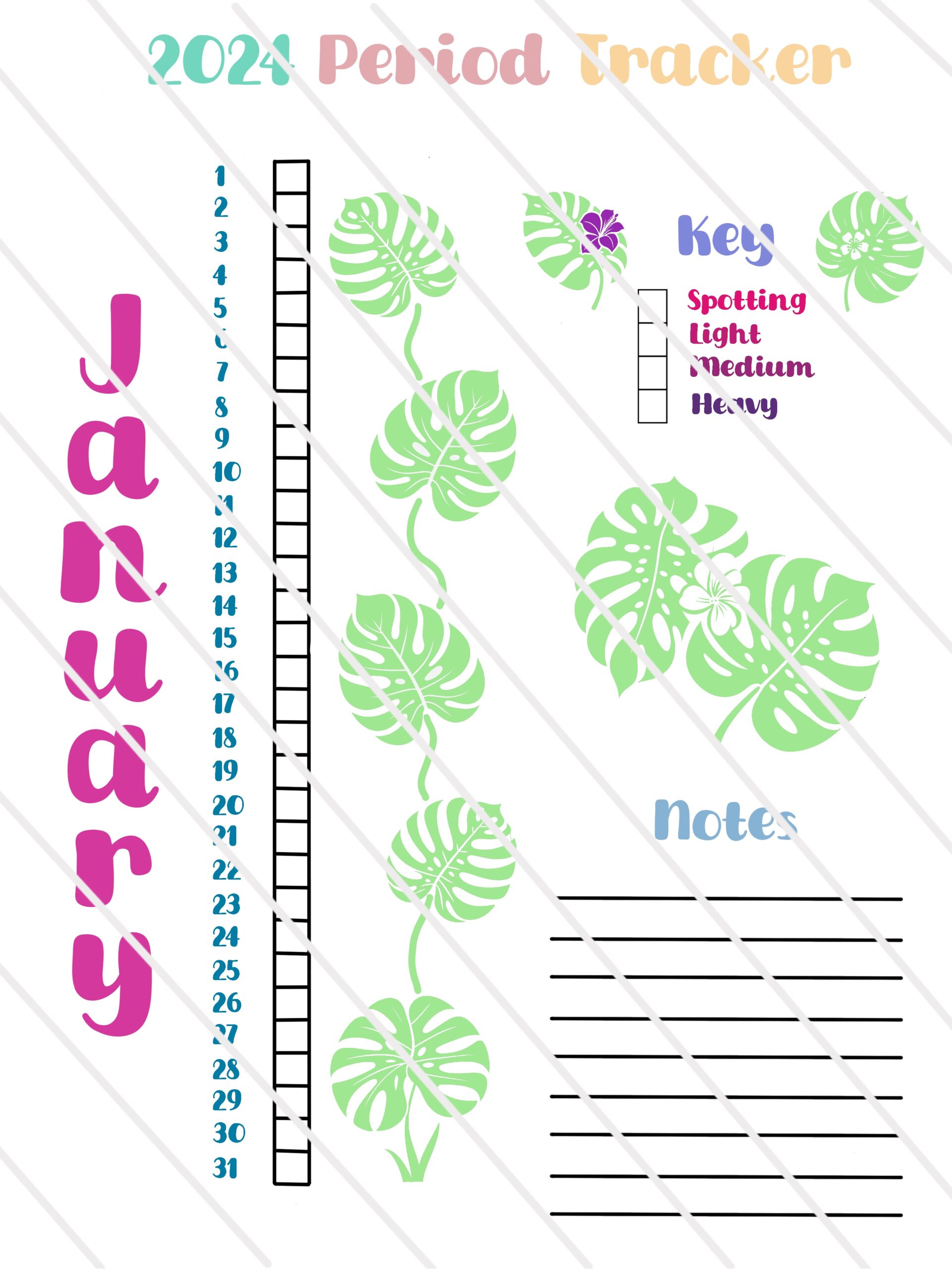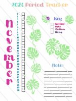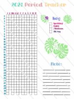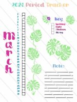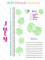 Designed for ease of use, this printable planner allows you to monitor your monthly cycle efficiently. The year-long sheet provides an overview, while individual monthly trackers offer detailed insights. The pastel colours and monstera leaves decorations add a touch of tranquility to your planning routine.