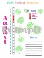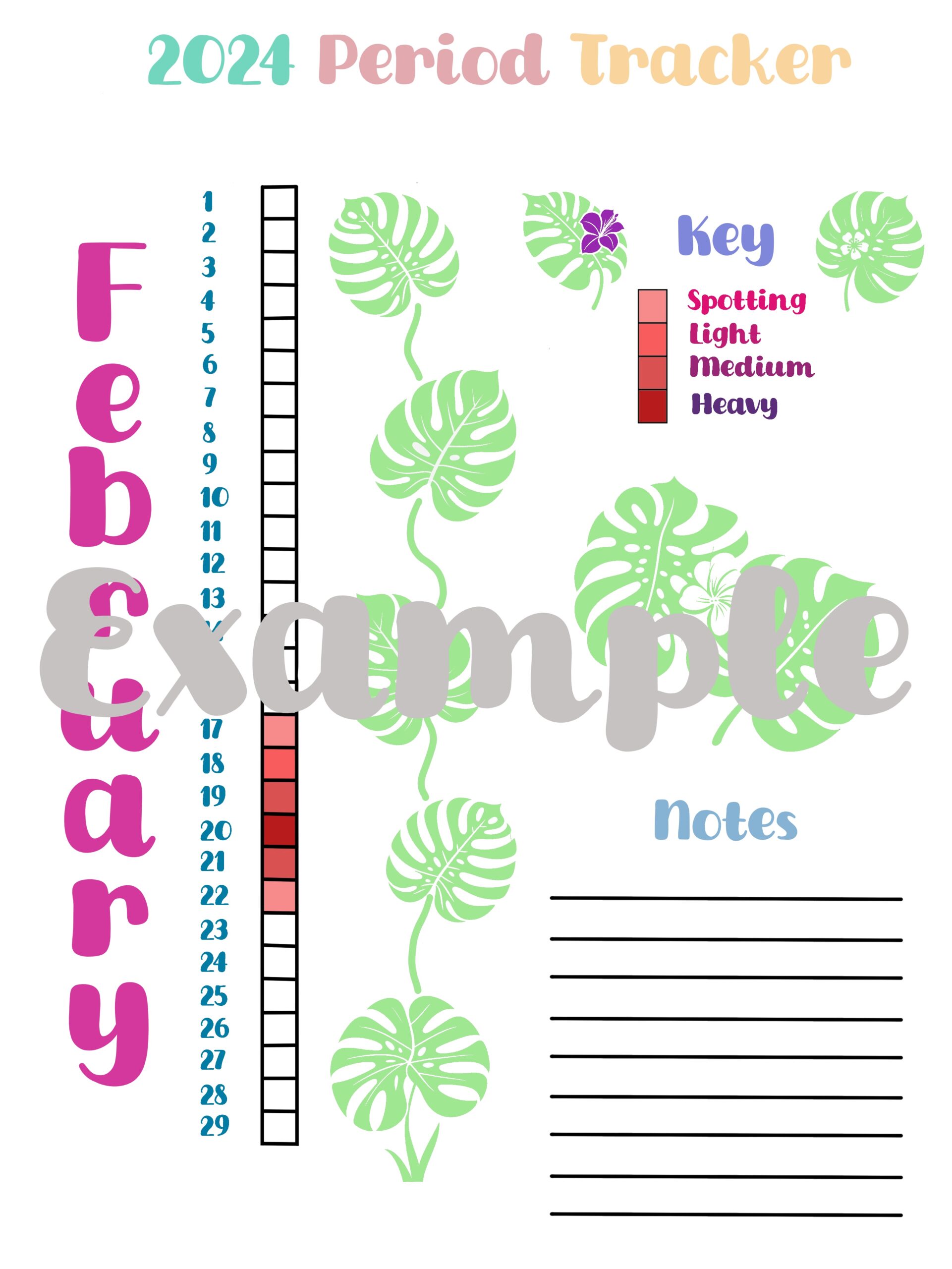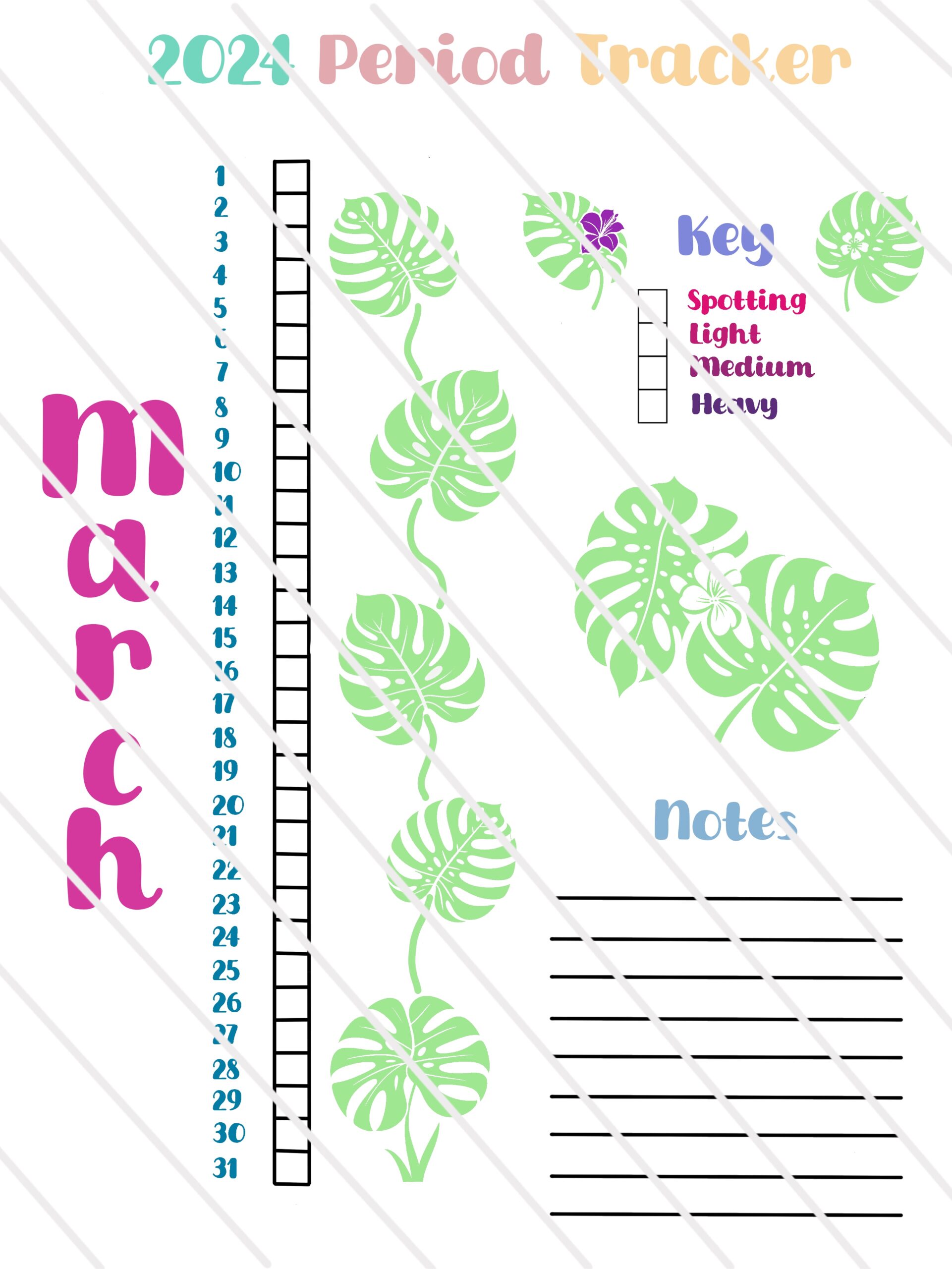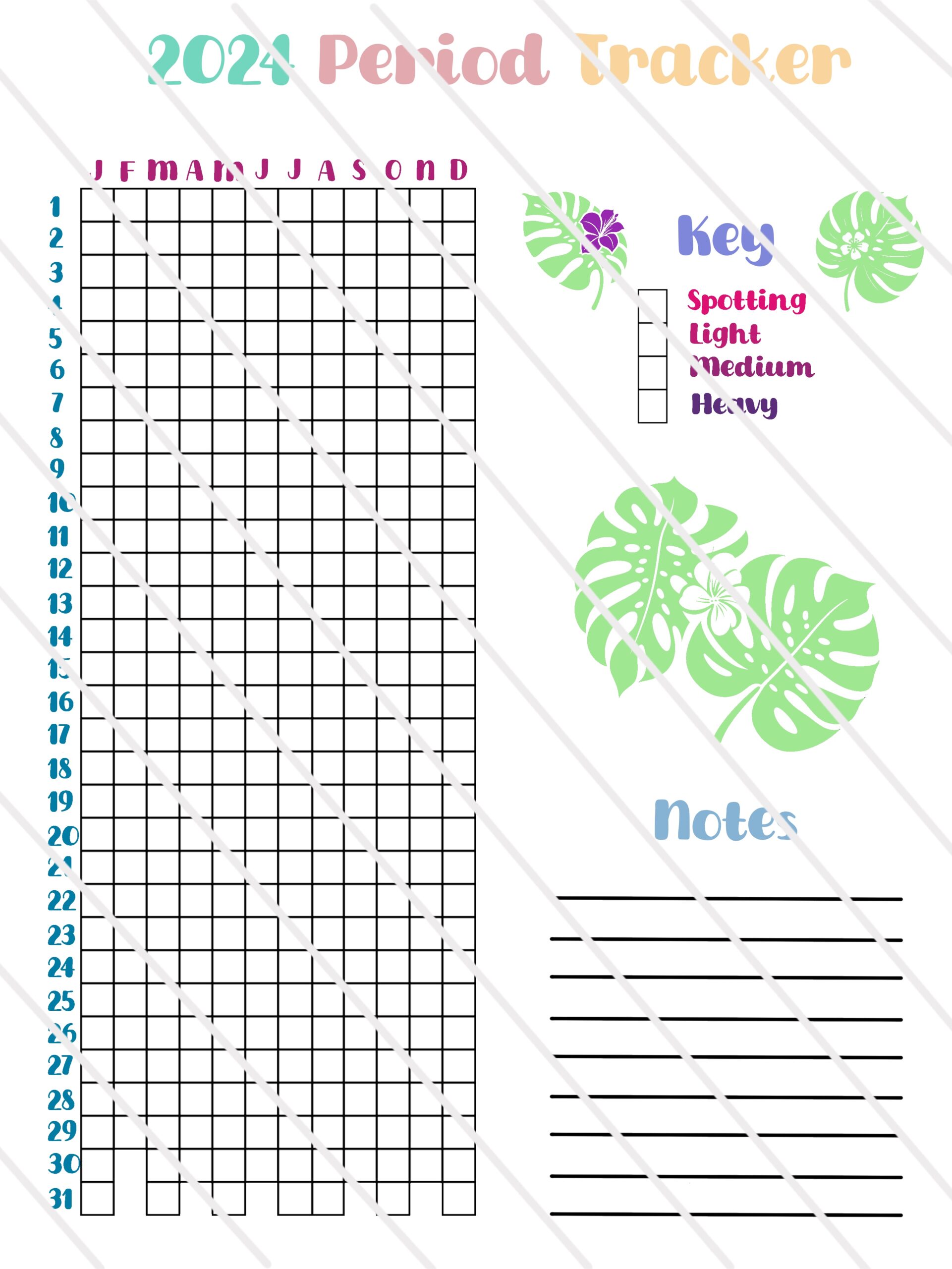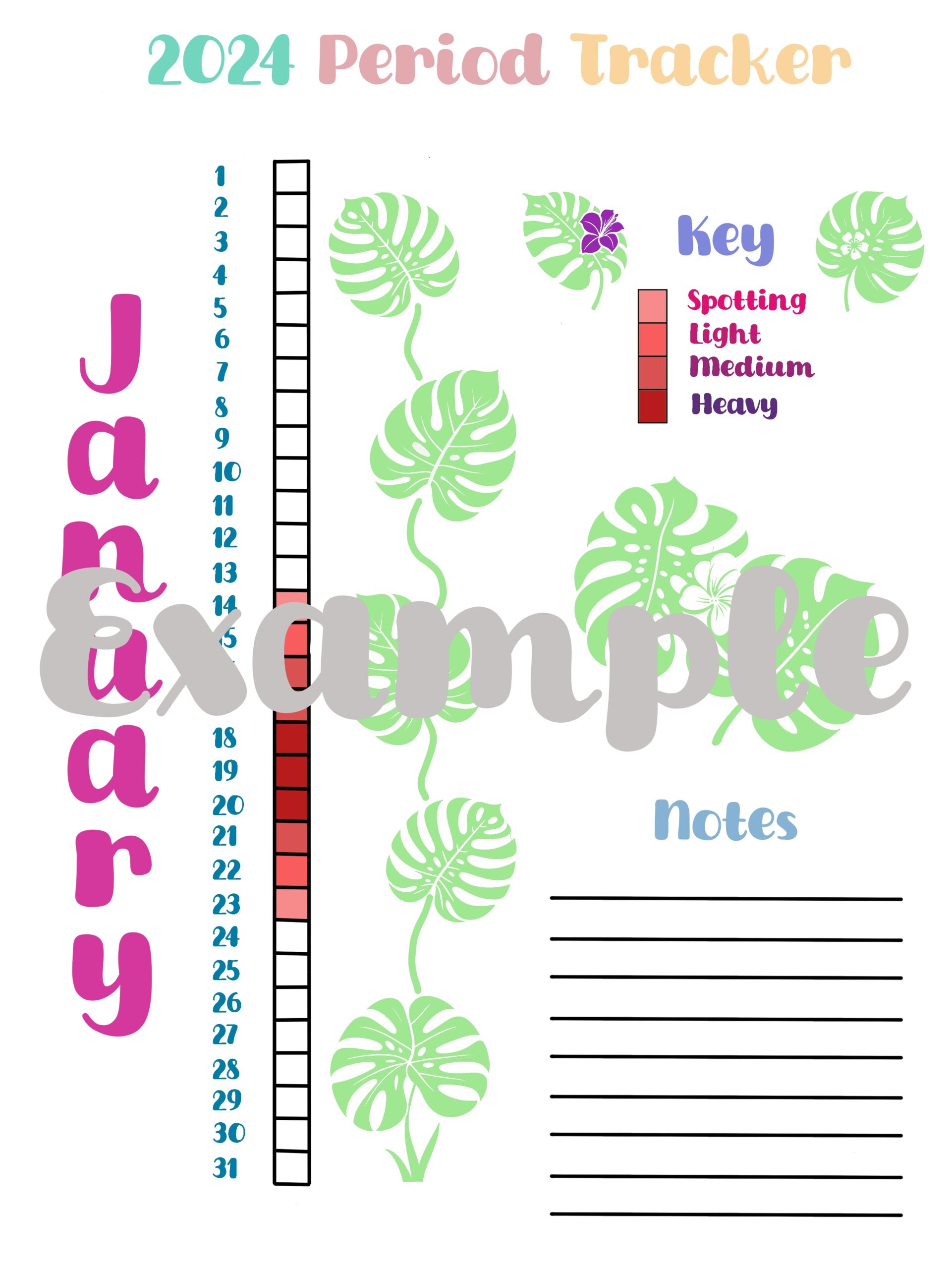Designed for ease of use, this printable planner allows you to monitor your monthly cycle efficiently. The year-long sheet provides an overview, while individual monthly trackers offer detailed insights. The pastel colours and monstera leaves decorations add a touch of tranquility to your planning routine.